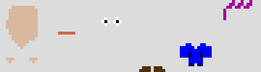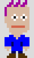 Perhaps an example is in order. Consider the rather snazzy (and somewhat surprised) looking individual on the left. He’s actually composed of a number of different layers in gimp, which are grouped and arranged in such an order that when one layer from each group is visible, they combine to create a character (in this case a mildly-shocked purple-haired gentleman in a blue sweater).