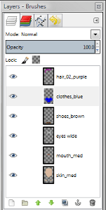 There are a number of these files, some covering people (as in this example), some with vehicles, some with background objects, and so on. And in each one, there are many layers each with a different sprite image. Not all are overlaid in this way, but they all use gimp’s layer features. Continuing the example, the image on the right shows you the gimp layers palette with the various layers that comprise the purple-haired dude.